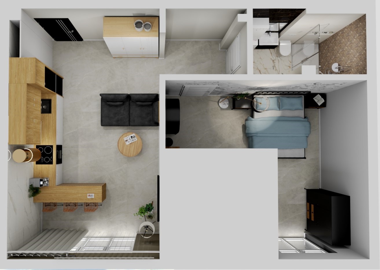 1. Przedstawiona na rzucie aranżacja ma charakter poglądowy, umeblowanie i wykończenie nie stanowi wyposażenia nabywanego lokalu.