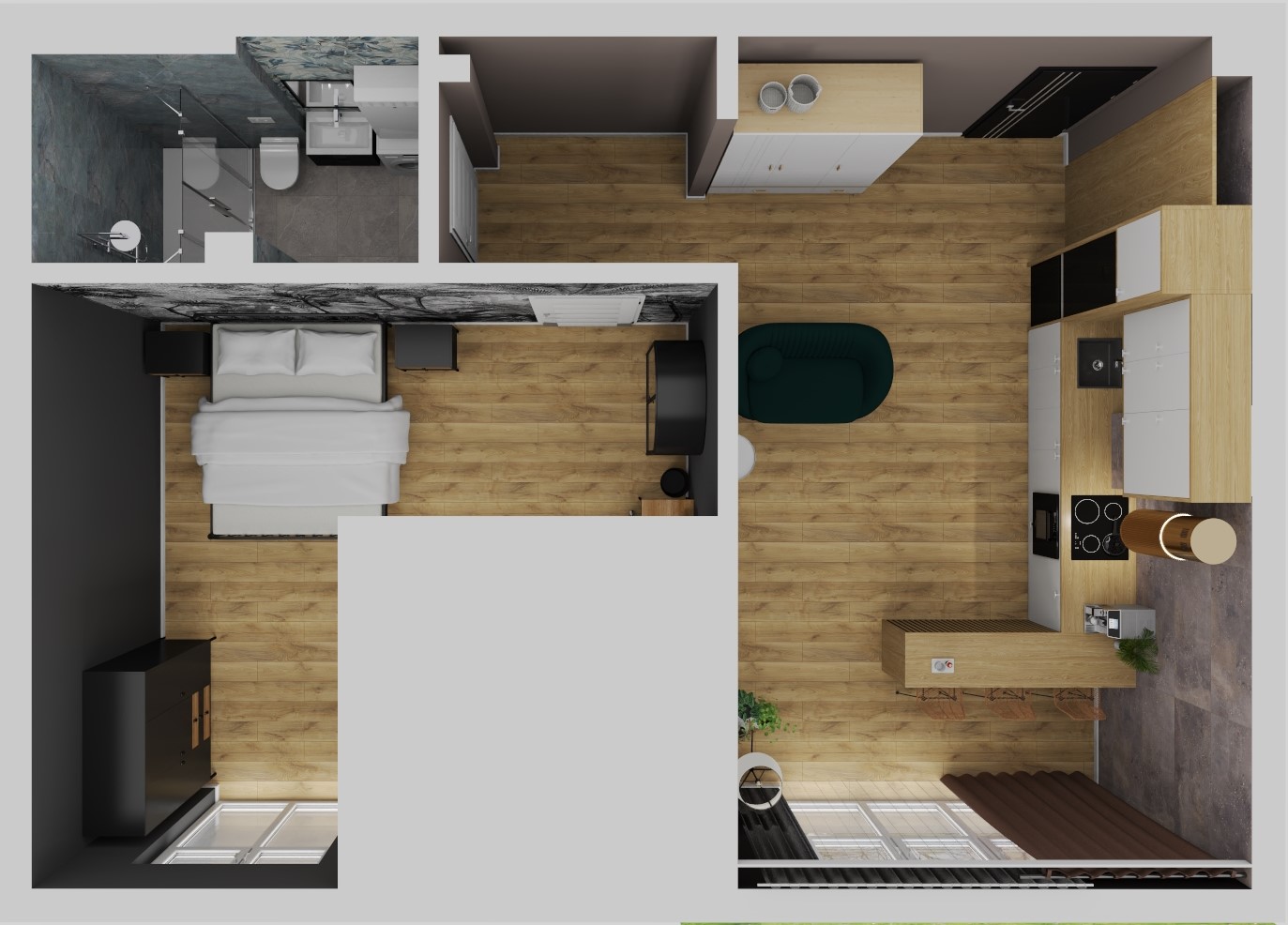 1. Przedstawiona na rzucie aranżacja ma charakter poglądowy, umeblowanie i wykończenie nie stanowi wyposażenia nabywanego lokalu.